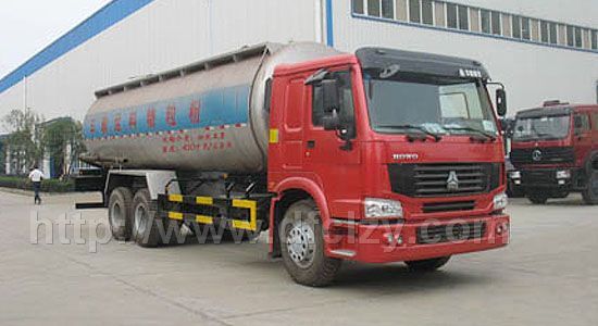 專用性能:粉粒物料運輸車利用本車動力驅動空氣壓縮機, 將壓縮空氣經管道送入密封罐體下部的氣室,使氣室液態化床上的粉粒體懸浮成流態狀,當罐內壓力達到額定值時,打開卸料閥,流動化物料通過管道流動而進行輸送。
