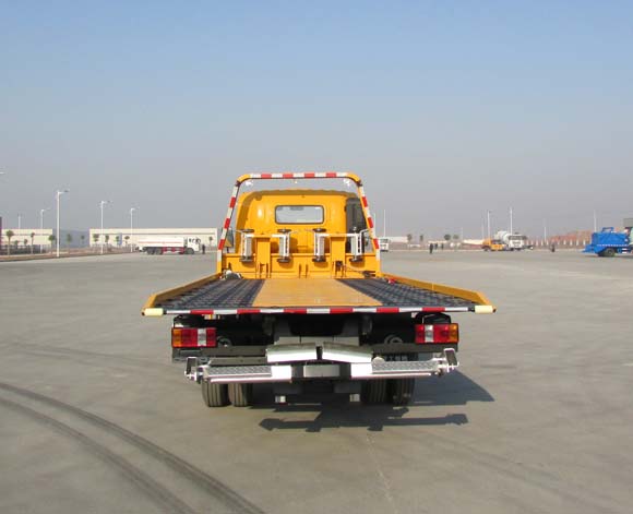 重汽豪沃一拖二平板型道路清障車上裝配置:起重裝置、托舉牽引裝置、液壓系統、電控系統、車體與工具箱等組成,具有起吊、拽拉和托舉牽引等多項功能。