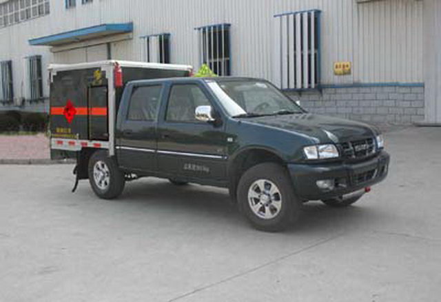 慶鈴五十鈴柴油皮卡防爆車\民爆車\爆破器材運輸車,該民爆車僅采用慶鈴五十鈴皮卡排氣管前置的專用車底盤。國四排放.廂體頂部密封,不可開啟。可采用慶鈴五十鈴100馬力發動機,有環保公告, 廂體外飾冷軋鋼板,內飾防靜電鋁板,底板鋪防靜電膠板,側壁設防雨通風窗口,帶捆綁固定拉環,煙霧感應器,防盜報警開關,靜電帶,滅火器2只,車廂黃色或灰色,有危險標志,貼有反光標識,廂體右側開側門。