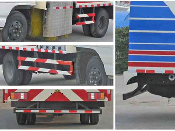 防護(hù)材料:Q235A碳鋼,連接方式:左右側(cè)面及后下部防護(hù)均采用焊接連接,后部防護(hù)斷面尺寸(mm):100×50,后部防護(hù)離地高度(mm):380。隨底盤(pán)選裝駕駛室 |