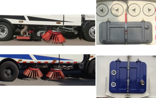 左右立掃為單掃盤,減少了掃刷數量和掃刷消耗量,能降低使用成本。左右立掃分開控制,可實現左、右全掃等作業模式。寬吸嘴的吸口寬度達到2100mm,確保作業總寬度大于2.8mm。4個高度可調的吸嘴輪,能方面調整和保證吸嘴與路面間的合理間隙。吸嘴內高有噴水桿,盡可能多地將高壓洗滌噴嘴布置在吸嘴內部,不但清洗效果好,還能最大限度減少高壓水氣流沖起污物產生的二次污染。左右噴水桿安裝在吸嘴上,隨吸嘴升降,結構簡單緊湊,保證噴水桿的離地高度固定不變,達到最佳清洗效果。開式液壓系統驅動左右立掃升降、左右掃盤旋轉、吸嘴升降、垃圾箱后門開閉、垃圾箱傾翻復位等機械動作。底盤變速箱側取力器驅動低壓水泵,實現灑水車的低壓沖洗功能。專用工作裝置電控系統采用PLC智能化控制,一鍵式作業起動和停機操作。