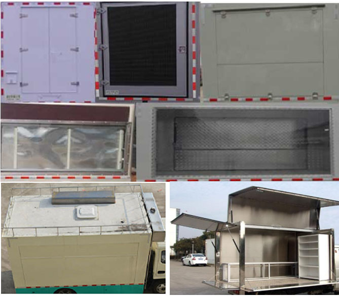 車輛顏色可選,文字噴涂位置可變化,車廂頂部選裝天窗、排煙罩,排氣口,護(hù)欄,水箱,護(hù)欄;整車外觀噴涂或粘貼宣傳標(biāo)識;廂內(nèi)內(nèi)部設(shè)備可根據(jù)用戶要求定制如發(fā)電機(jī),冰柜,冷飲機(jī),售貨臺,炊具等;左側(cè)右側(cè)后側(cè)選裝不同結(jié)構(gòu)形式的側(cè)翻門、吧臺、舞臺、遮陽板、裝玻璃窗、亦可選裝LED屏舉升或者不舉升;前部選裝水箱;后部選裝LED屏,或者選裝百葉窗,爬梯,或者上翻或者側(cè)翻門;隨底盤選裝駕駛室。該車選用軸距:4100,3800。ABS型號:ABS/ASR-24V-4S/4M,廠家:襄陽東風(fēng)隆誠機(jī)械有限責(zé)任公司。 |
