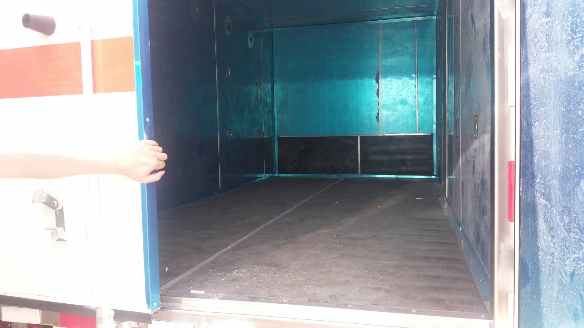 躍進小福星藍牌爆破器材運輸車/防爆車/民爆車廂體外飾外板采用1mm厚冷軋板有一次成型的百葉窗,內飾為導電性能良好的鋁板含透氣孔,內襯為矩形管骨架牢靠穩定,內部填充為透氣防潮阻燃的擠塑板,底板和車廂前下部鋪橡膠皮,廂體外部上下鋁合金型材包邊,后門雙開,右側選裝側開門,內部有固定貨物的臥環,外部有靜電帶,滅火器,防火罩,廂內安裝煙霧警報器和門防盜報警器.