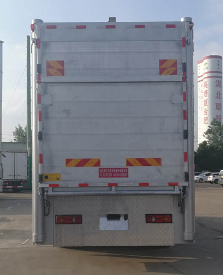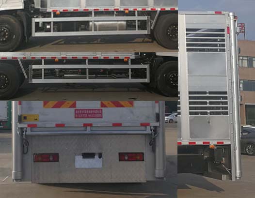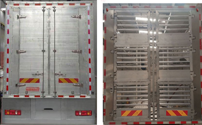 整車備注: 擴(kuò)展箱體后門結(jié)構(gòu);隨底盤選裝駕駛室;選裝兩層、三層、四層倉柵結(jié)構(gòu);選裝箱體前部帶單開門和封板結(jié)構(gòu);選裝前部帶空調(diào)結(jié)構(gòu);選裝后部液壓圍板結(jié)構(gòu),后部裝有升降機(jī)和液壓尾板,液壓尾板收起狀態(tài)的水平長度為280mm,液壓尾板重量550kg;選裝后部不帶升降機(jī)和液壓尾板結(jié)構(gòu),即普通雙開門結(jié)構(gòu)時(shí),整備質(zhì)量為8400kg;整車長/貨箱內(nèi)長/軸距/后懸對應(yīng)關(guān)系(mm):9000/6750/5000/2570,9000/6400/5000/2570,8600/6150/4700/2470;僅采用5000mm和4700mm軸距;整備質(zhì)量/載質(zhì)量對應(yīng)關(guān)系(kg):8850/8955,8400/9405;貨箱底板到倉柵頂部的高度為2600mm,箱體兩側(cè)開窗,中間有隔欄,側(cè)防護(hù)材質(zhì):矩形鋁合金型材6061-T5,連接方式螺栓連接;后防護(hù)材料Q235B,焊接連接,與車輛結(jié)構(gòu)為一體,后防護(hù)斷面尺寸:120×80mm,下邊緣離地高度430mm;ABS型號(hào):3631010-C2000;生產(chǎn)廠家:東科克諾爾商用車制動(dòng)系統(tǒng)(十堰)有限公司;安裝帶有衛(wèi)星定位功能的行駛記錄儀;采用的發(fā)動(dòng)機(jī)與油耗值(L/100Km)對應(yīng)關(guān)系為: ISD270 50/29.0,ISD210 50/29.0,ISD180 50/29.0,EQH180-53/29.0,ISB180 50/29.0,ISB210 50/29.1;該車專用裝置主要由箱體組成,用于畜禽運(yùn)輸.