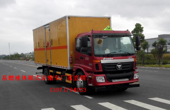 福田奧鈴國五易燃氣體(液體)廂式運輸車廂體外飾冷軋鋼板,內飾防靜電鋁板,底板鋪防靜電膠板,側壁設防雨通風窗口,帶捆綁固定拉環,煙霧感應器,防盜報警開關,靜電帶,滅火器2只,車廂黃色,有危險標志,貼有反光標識。