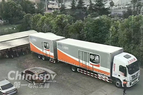 申通快遞率先掛牌上路。據了解,該款紅巖杰獅C500底盤是空氣懸架、駕駛室四點懸浮式設計、整車軸荷優化分布等都讓駕駛更平穩舒適,最大可達117 m³的超大容積,較傳統車型容積提升40%以上,承載總重最高可達49噸,這輛8×4中置軸貨運列車可以說是目前國內裝載容積最大、承重最大的貨運列車!