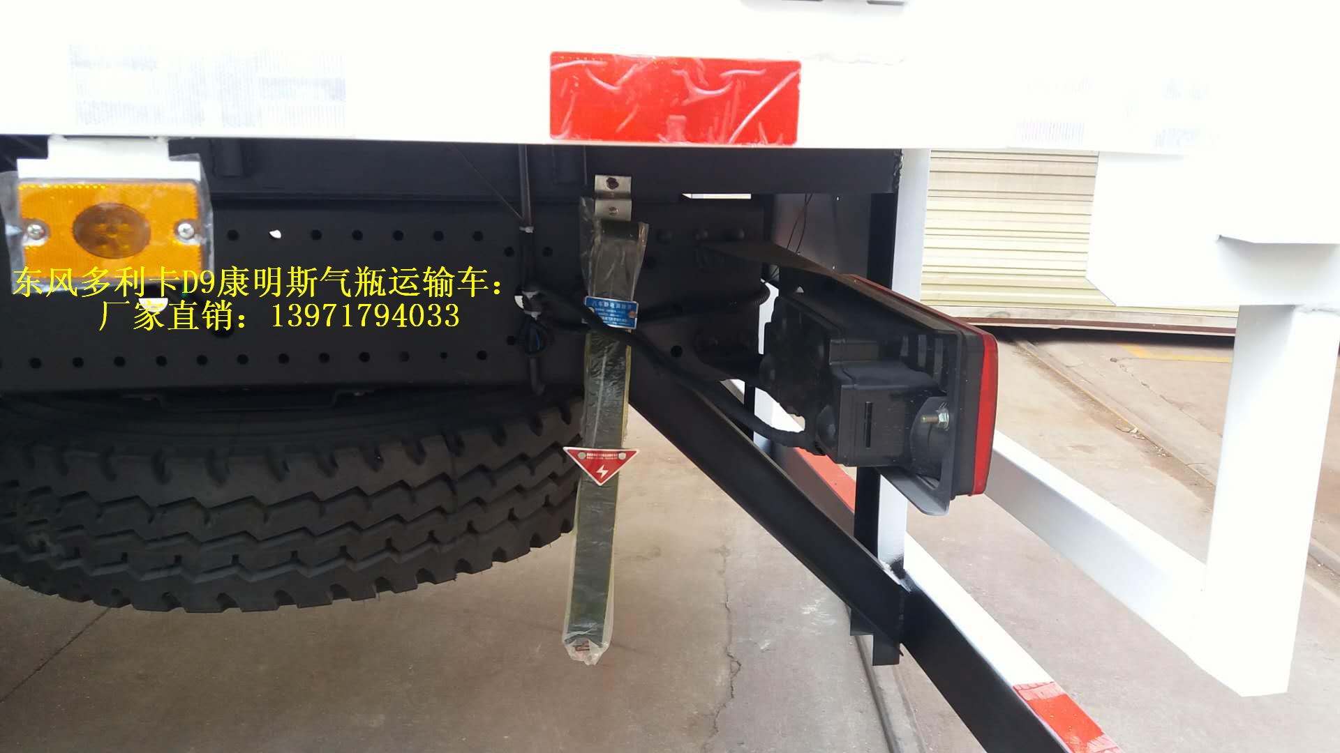 東風多利卡D9康明斯氣瓶運輸車為廂體選裝無柵欄.運輸具有獨立罐(瓶)容器包裝的易燃氣體:液化石油氣,壓縮天然氣,乙炔,乙烷,丁烷,丁烯,丙烯.甲烷.二甲醚,壓縮氫.類項號2.1,運輸具有獨立容器包裝的非易燃無毒氣體:二氧化碳,壓縮氧. 壓縮空氣(氮,氦,氬,氖),類項號2.2,該車運輸的氣瓶盛裝介質2.1項易燃氣體時,車輛左、右側及后部粘貼“易燃氣體”標示牌,該車運輸的氣瓶中盛裝介質2.2項非易燃無毒氣體時,車輛左、右側及后部粘貼“不燃氣體”標示牌.廂體顏色可變化.側面及后下部防護裝置材料為Q235,與車架采用焊接連接.后下部防護裝置斷面尺寸(mm):120×50,離地高度:490mm。選裝液壓升降尾板,選裝液壓尾板時收起狀態的水平長度為300mm,僅采用排氣管前置、子午胎,限速裝置,輔助制動裝置和前盤制動器的底盤;限速80km/h.。