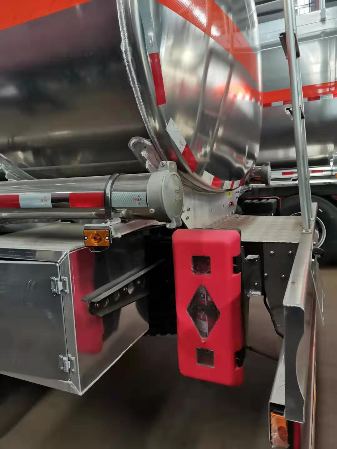 鋁合金化工車選裝大排量安全閥,有效防止安全事故發生。另外還有緊急切斷底閥、呼吸閥、罐頂保護裝置等,有效防溢流、防側翻。除此之外,電器系統采用整體式線束,與燈具相連的插接件選用防水插接件,安全性更高。