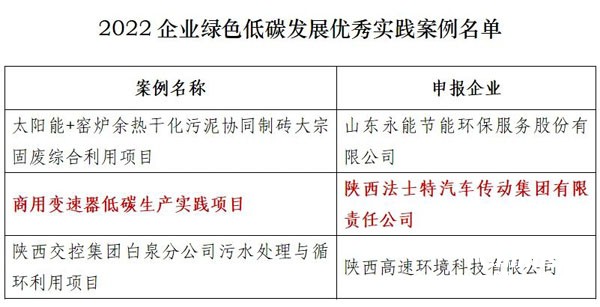 法士特集團《商用變速器低碳生產實踐項目》入選“2022企業綠色低碳發展優秀實踐案例” 程力專用汽車股份有限公司